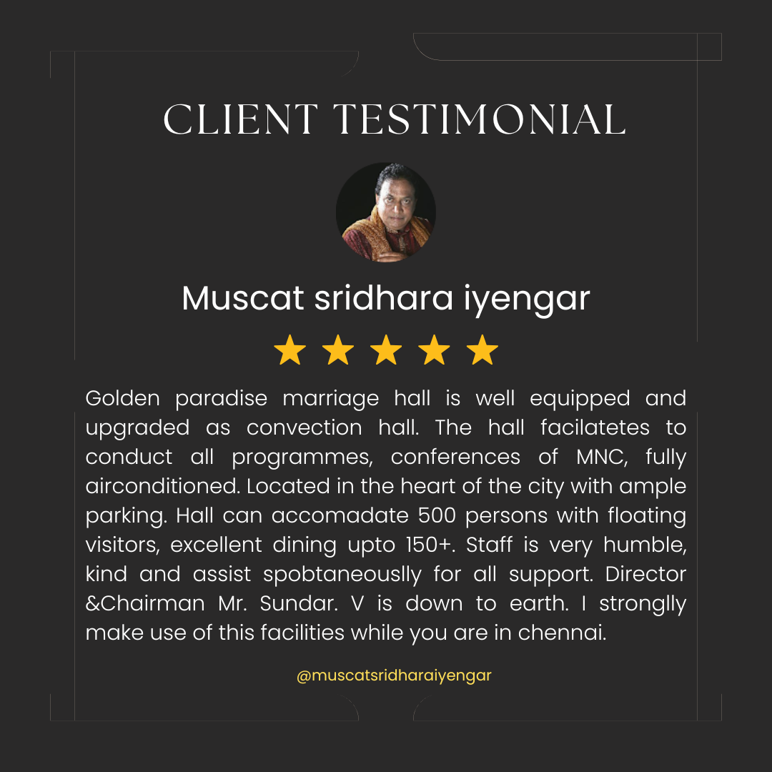 Golden Paradise Thirumana Koodam (Newly Renovated) is the best marriage hall in Saligramam, Chennai, near KK Nagar and Vadapalani. Ideal for weddings, receptions, and family functions, we offer seating for up to 600 guests, with fully air-conditioned dining and 12 AC guest rooms. Customers find us while searching for “marriage halls in Chennai,” “kalyana mandapam near me,” or “wedding venues with 500+ capacity.” Located on Shop No. 10, 80 Feet Road, Sathya Garden, Saligramam, with valet parking, 100% vegetarian catering, beautiful interiors, and an affordable price, make us one of the best marriage venues in Chennai. Call now to book! Kalyana mandapam near me AC marriage hall in Chennai Marriage hall in Saligramam Wedding venue in Chennai